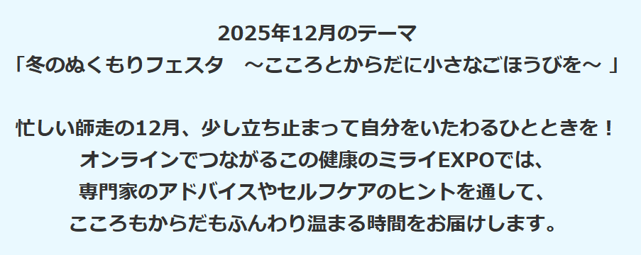 2025年12月14日(日) 09:00 第46回 健康のミライEXPO 第46回(12月開催)のテーマは 「冬のぬくもりフェスタ 〜こころとからだに小さなごほうびを〜 」 忙しい師走の12月、少し立ち止まって自分をいたわるひとときを!オンラインでつながるこの健康のミライEXPOでは、専門家のアドバイスやセルフケアのヒントを通して、こころもからだもふんわり温まる時間をお届けします。 ☆☆☆☆☆☆☆☆☆☆☆☆☆☆☆☆☆☆ 「健康のミライEXPO」とは・・・健康になるだけでなくその先のキラキラした未来を見つけるための『健康のテーマパーク』 ストレス、病気、経済・・・不安をあおるような情報がいっぱいで何が必要?何が正しい?どれが自分に合うのか?沢山の混乱を起こしやすい時代です 年齢、性別問わず、愛に満たされて、毎日が楽しくて、ハッピーになりたい方は是非、ご参加ください ♪健康にどん欲な出展者たちが全力でサポートします! ホームページhttps://foex.online/kenkoumirai ☆☆☆☆☆☆☆☆☆☆☆☆☆☆☆☆☆☆ -