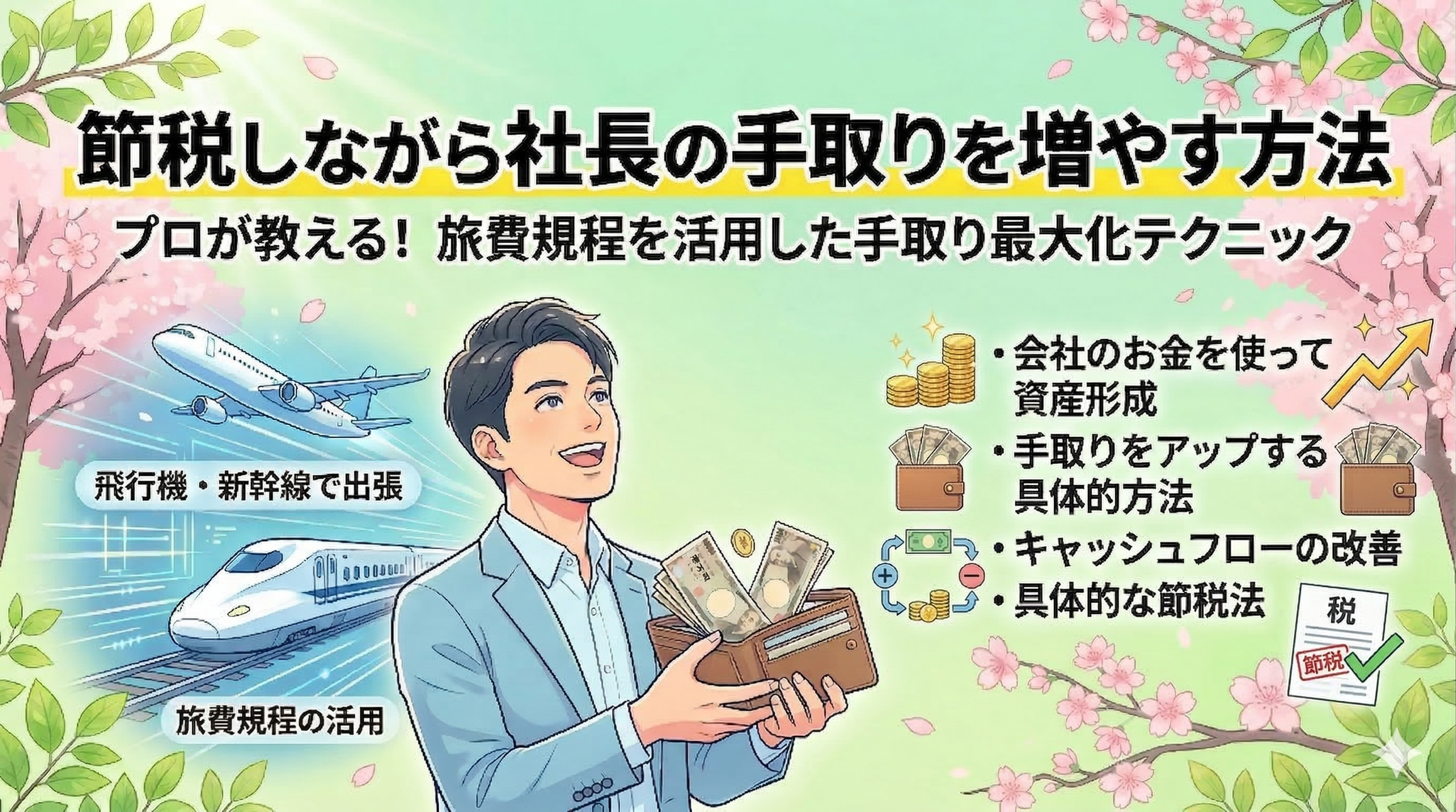 2026年4月18日(土) 11:00 第2回 元福岡県庁マンFPが伝える『節税しながら社長の手取りを増やす』オンラインセミナー このセミナーで学べるポイント 〇旅費規程の徹底活用術1日4時間外で仕事をすると日当が非課税で貰える? 〇合法的に「手取り」を最大化する具体策役員報酬だけに頼らない、キャッシュフローを改善するための実践的なテクニック 〇会社のお金を使った賢い資産形成個人の持ち出しゼロ!会社のお金で資産形成を作る方法。 このような経営者の方におすすめです ☆節税しながら社長の手取りを増やしたい方 ☆「会社の利益は出ているのに、自分の手元に現金が残らない」と感じている方 ☆社会保険料や税負担を賢く抑え、手取り額を増やしたい方 -