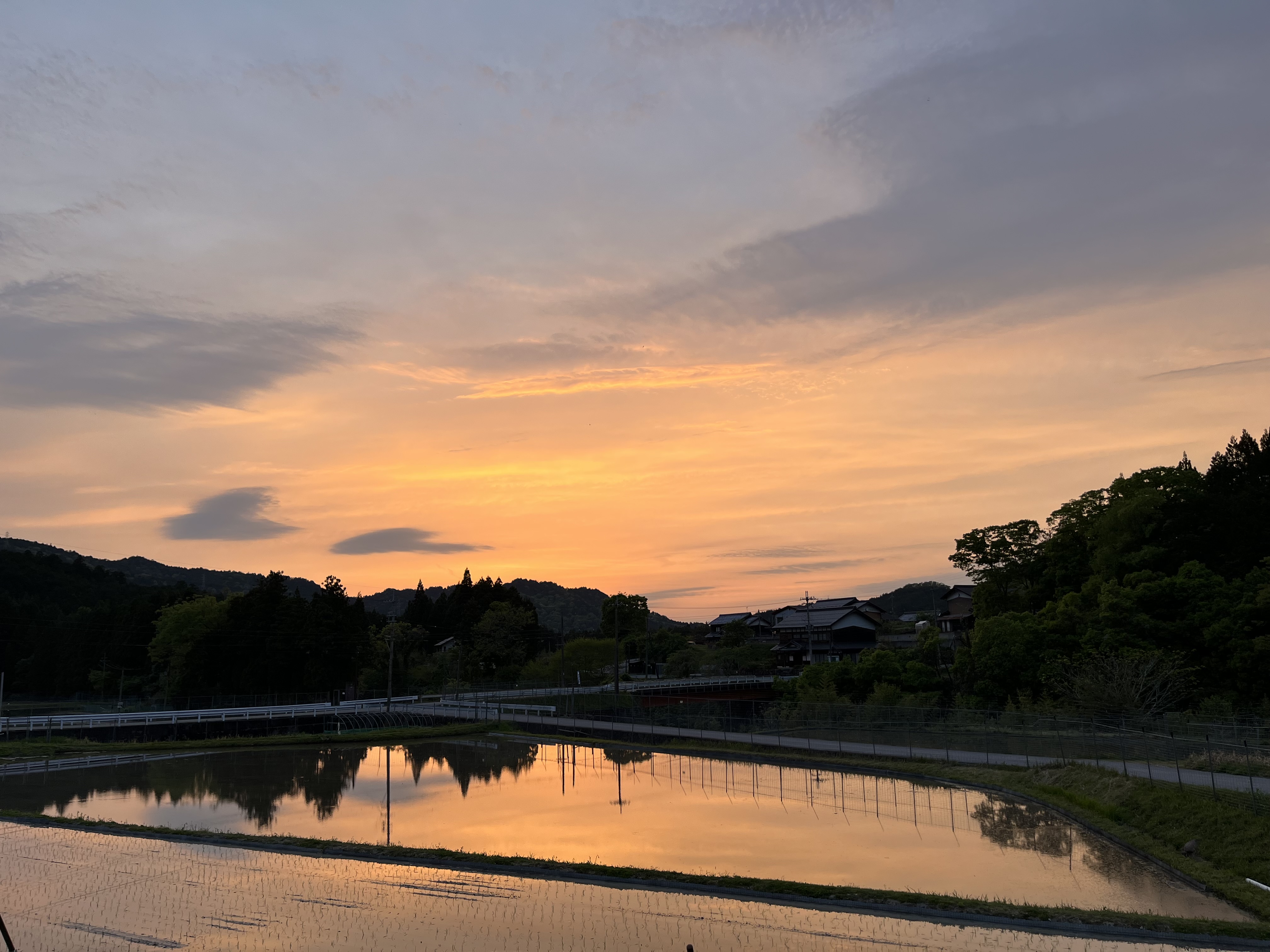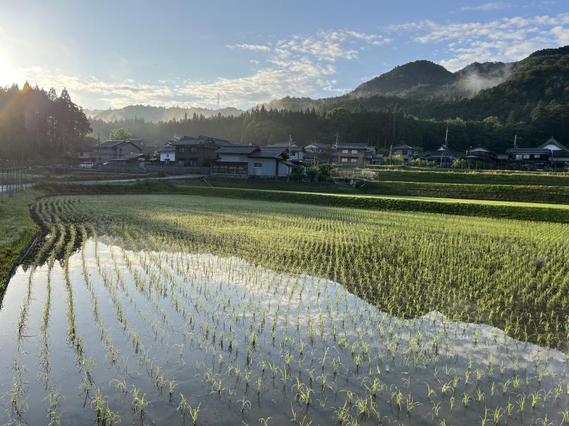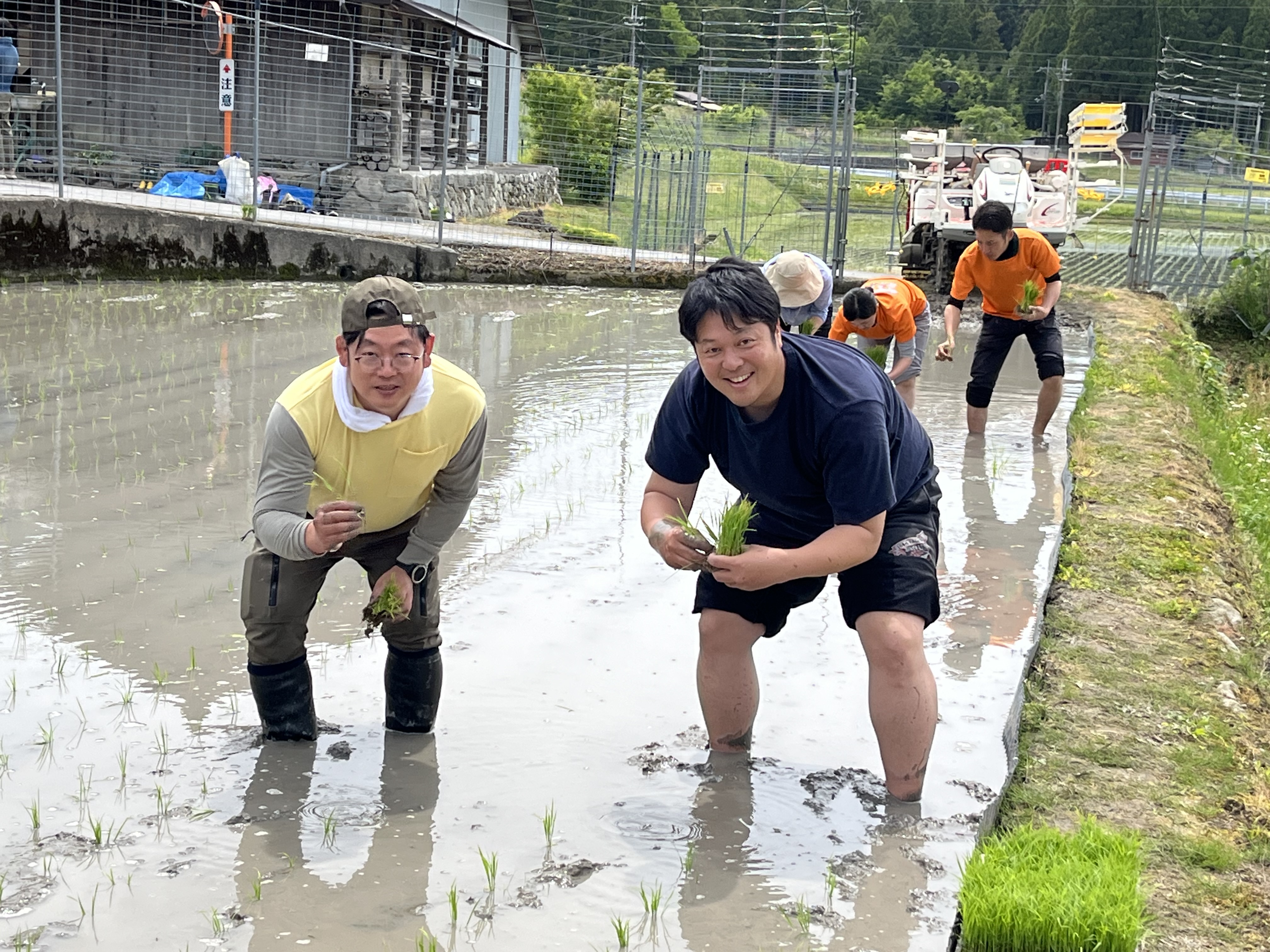 山に囲まれた水田にお米の苗とマコモダケの苗を植えます。