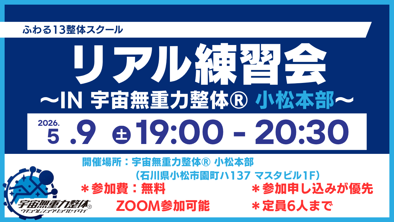 開催場所:石川県小松市園町ハ137 マスタビル1F (宇宙無重力整体®)