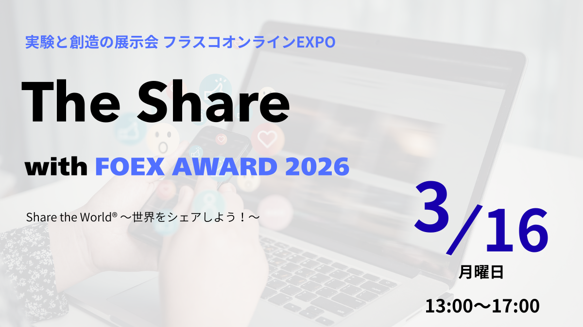 2026年3月16日(月) 13:00 The Share with FOEX AWARD 2026 FOEX 全テーマ合同EXPO & 年間表彰イベント全国の起業家・クリエーターが集まり、ビジネスやアイデアを**“シェア”**し合う特別なオンライン展示会イベントを開催! 【参加無料・途中入退室OK】 今回は、普段それぞれのテーマで開催しているEXPOが集まる全テーマ合同EXPOと、コミュニティの活動を称える年間表彰を同時開催します。 ◇タイムスケジュール 13:00〜14:30=The Share(オンラインEXPO) 14:30~15:30=FOEX AWARD 2026 15:30〜17:00=The Share(オンラインEXPO) このイベント主催である『フラスコオンラインEXPO(FOEX)』 その原点となったのが地域を越えて人と人をつなぐ交流コミュニティ『オンラインほぼ県人会』 この活動から発展する形でFOEXが生まれ両コミュニティはしばらく並行して活動してきました その後、オンラインほぼ県人会は約2年前に一度休止 そして今回―― イベント名も新たに、心機一転リニューアルスタートします こんな方におすすめ!・新しいビジネスのつながりを作りたい・オンラインイベントや展示会に興味がある・全国の起業家やクリエーターと出会いたい・FOEXの雰囲気を見てみたい そんな方は、ぜひお気軽にご参加ください! 気になるブースを自由に回ることができます。 -