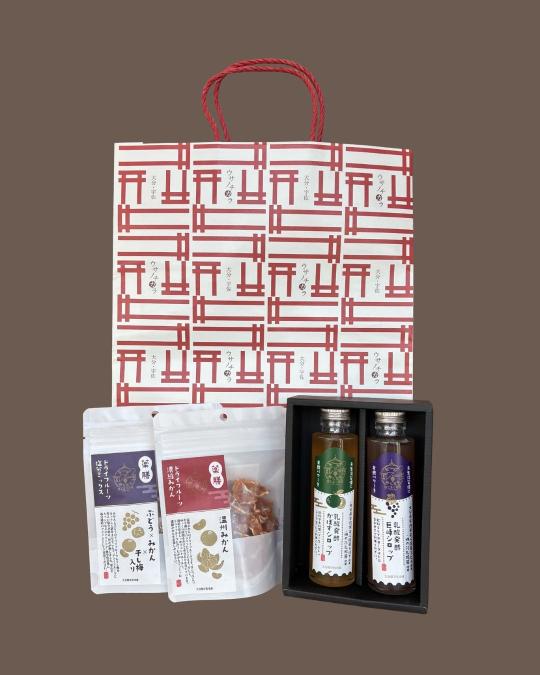 国産ドライフルーツ/みかん(70g)、ドライフルーツ塩分ミックス/ぶどう・みかん・干し梅(70g)、乳酸発酵巨峰シロップ(160ml)、乳酸発酵かぼすシロップ(160ml)の4点セットです。ご自宅用はもちろん、ギフトにも最適です。
