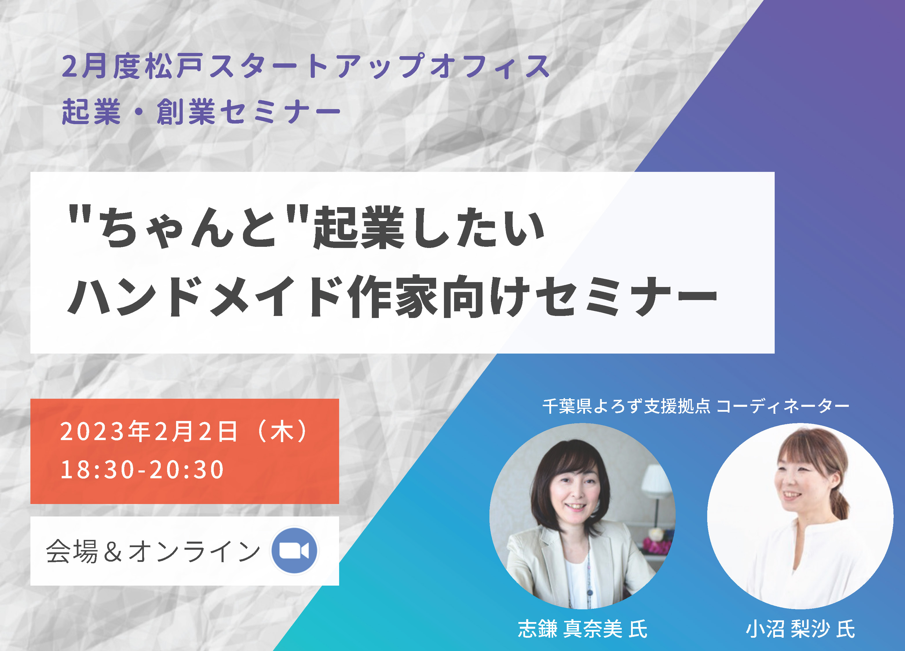 今回は、創業時に知っておきたいこと、事業の組み立て方、販売促進のためのSNS・WEB活用などハンドメイド作家向けにアレンジした内容です。ぜひご参加ください。