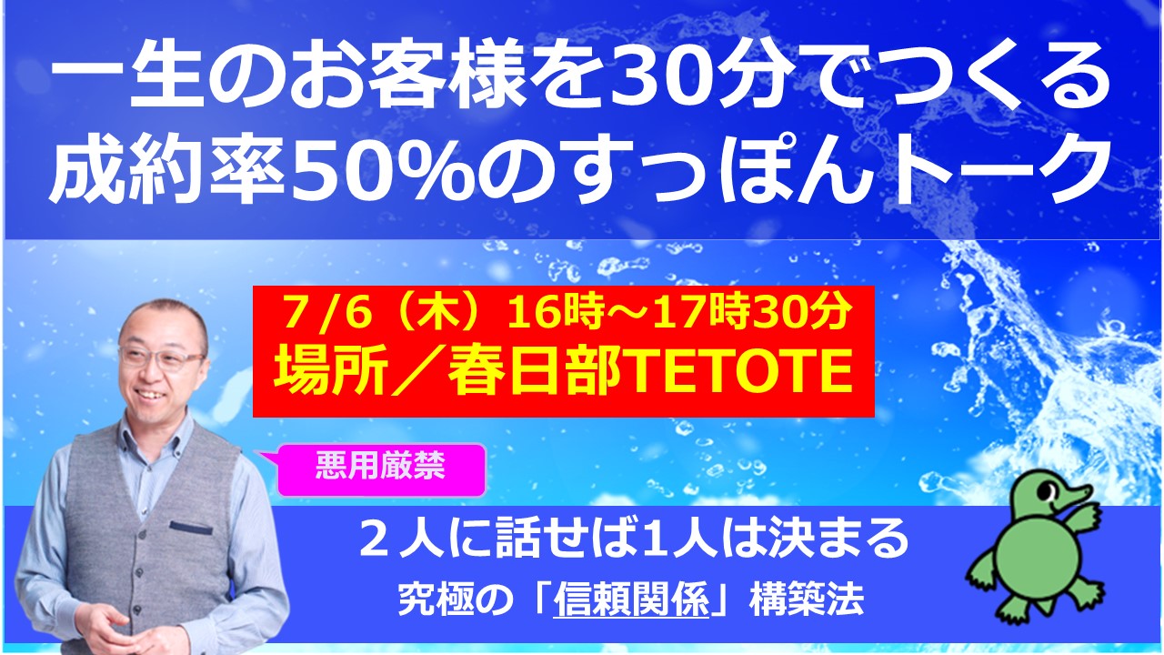 2023年7月6日(木) 16:00 一生のお客様を30分でつくる 成約率50%のすっぽんトーク!!参加者数:イベント評価: -